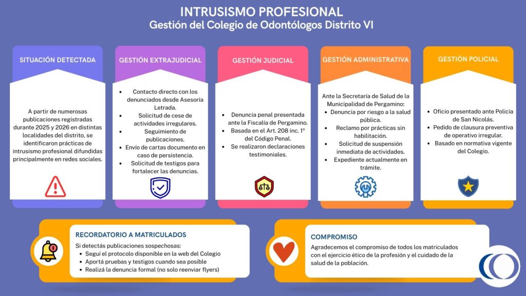 A partir de diversas publicaciones detectadas durante los años 2025 y 2026 en distintas localidades del Distrito, vinculadas a posibles situaciones de intrusismo en redes sociales, el Colegio de Odontólogos Distrito VI ha llevado adelante una serie de acciones en distintos ámbitos, con el objetivo de resguardar el ejercicio legal de la profesión y la salud de la comunidad.